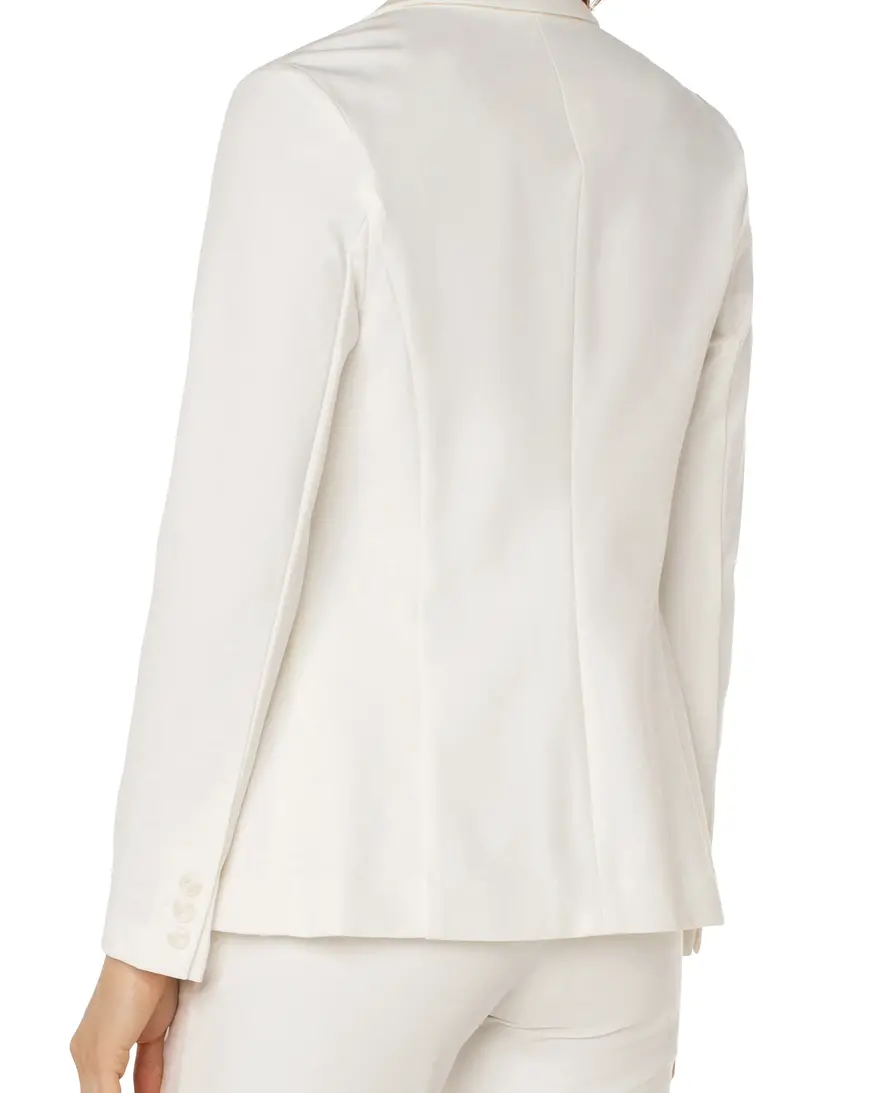 This fitted blazer is sleek, sophisticated and perfect for day or night. These pieces offer tremendous versatility and mixed and matched with denim. Pair with the matching pant for a winter white ensemble.