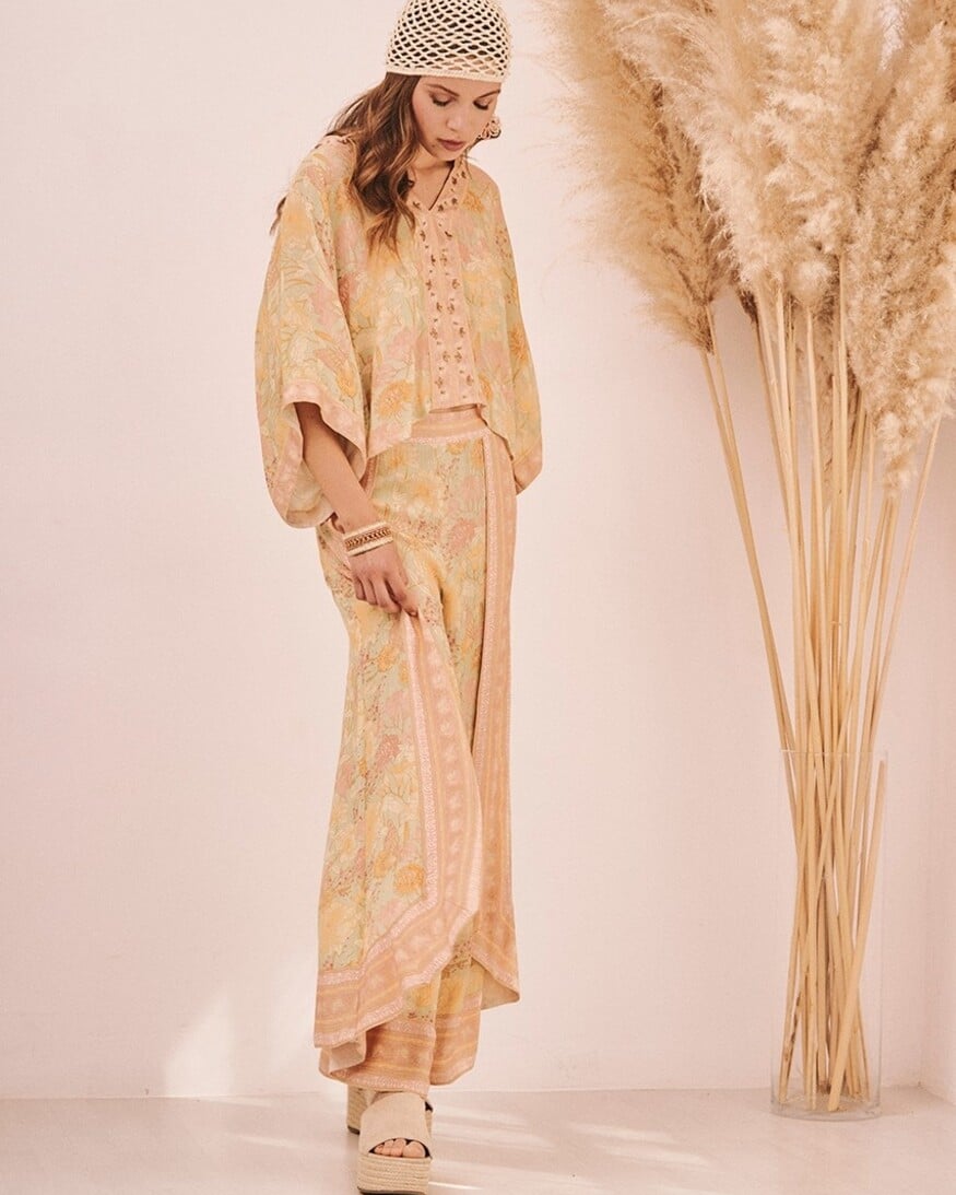 Short-sleeved Japanese blouse finished with ribbon trim. Cropped length, reaching to the waist. Floral print with butterflies. V-neckline trimmed with ribbon and embroidered stones.