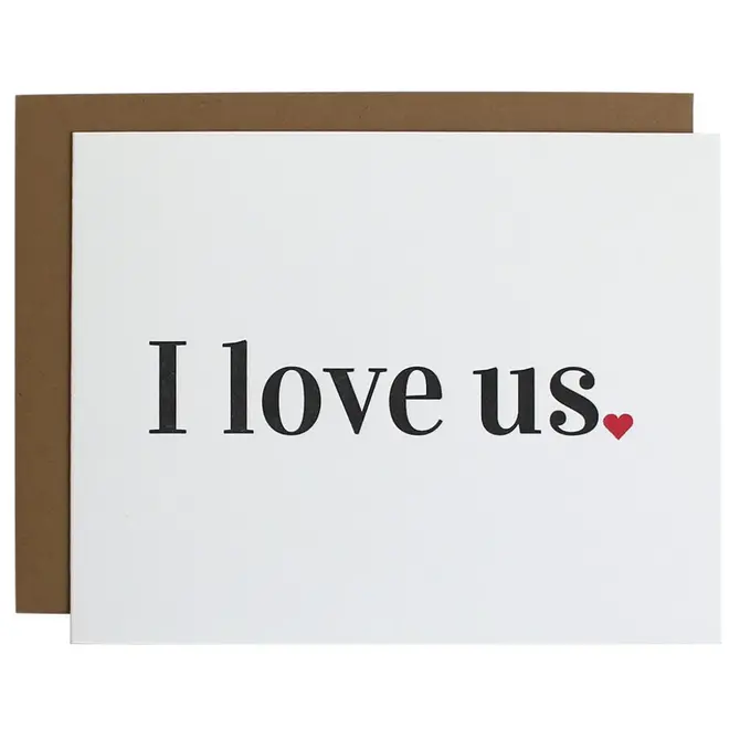 This "I Love Us" card is letterpress printed on a vintage printing press in sunny California.