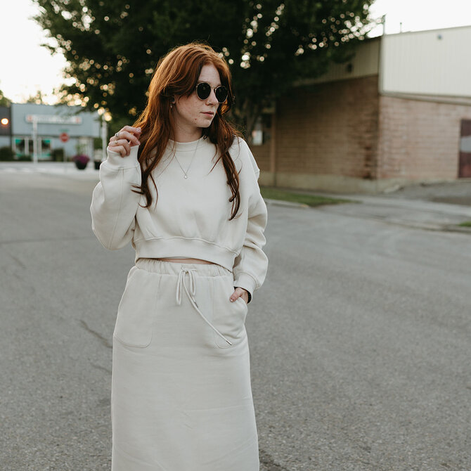 Recycled polyester cotton fleece midi skirt with two front pockets, drawstring and a slit in the back. You won't want to take this skirt off. Ultra comfy and chic, the skirt adds a modern touch to a sweat suit without compromising the cozy effects. Pair with the matching sweater for a put together ensemble.