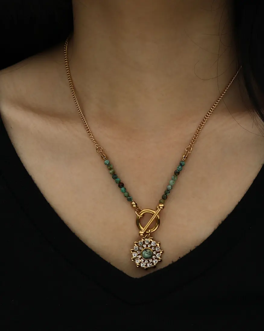 A bohemian vibe runs through this richly designed necklace. Natural stone beads combine with a Cuban style chain, topped off with a T-Bar Circle stopper and an intricate patterned pendant, embellished with zirconia and natural stone. Boho-Chic at it's finest.