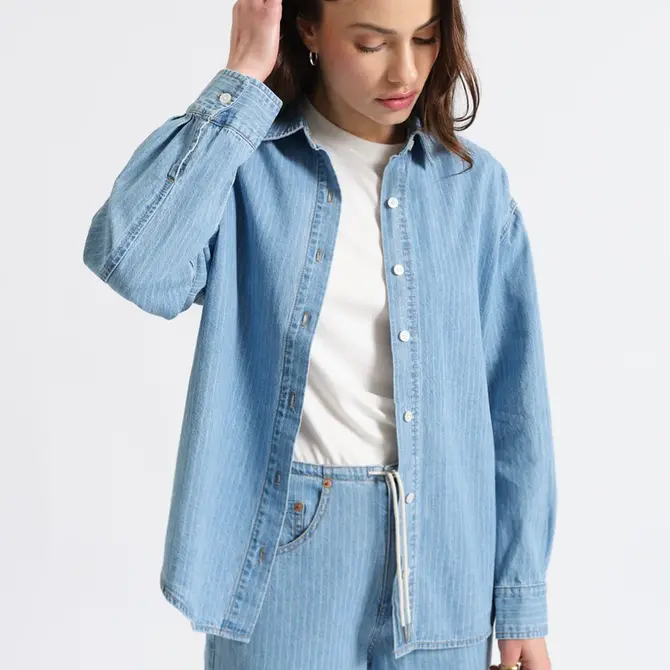 The Maddie in Whimsy is the perfect relaxed short. The mid-rise fit is tied together with a drawstring waist, and the wide leg fit features a light blue wash.