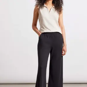 A wide leg and 25" inseam give these capris a trendy look, while the stretch-infused rib knit fabric wraps you in comfort. We love the pull-on waist with a 2.25" elastic band that won't dig into your sides, slanted hip pockets, and neutral color that offers endless pairing options.