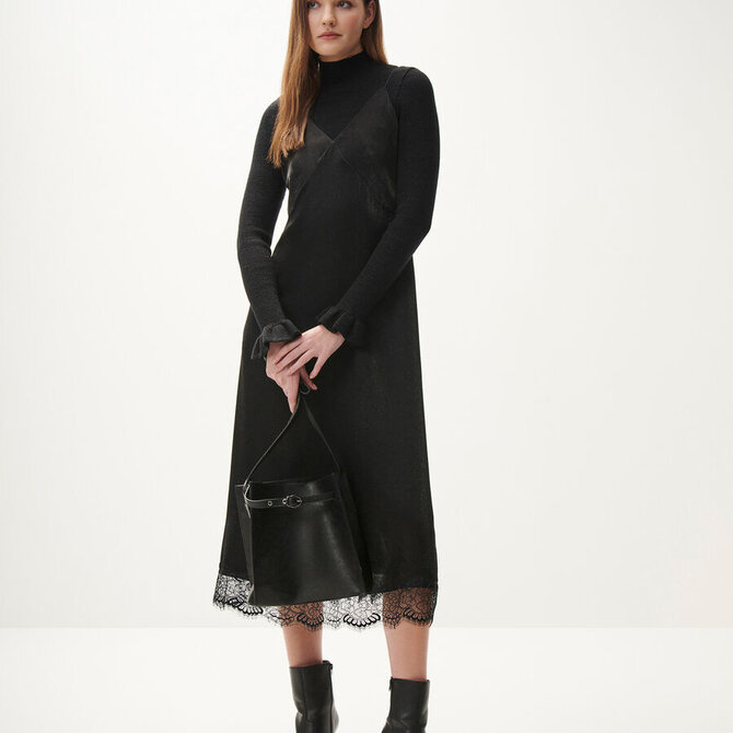 Made in Satin with a fluid drape. Piece from the Amar-se Collection with a straight, slip dress style that fits loosely on the body, V-neckline, adjustable straps, diagonal cutout at the bust, half lining and lace application at the hem.