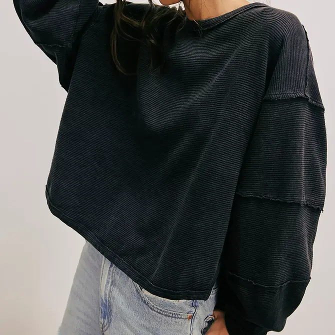 Ribbed fabrication, scoop-neckline, drop-shoulder sleeves with cuffs, defined seam detailing with raw trim