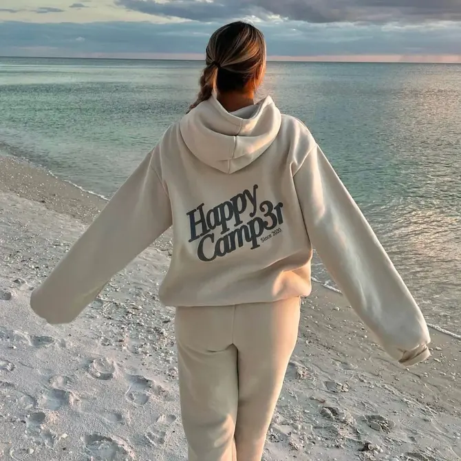 Beige fleece with thick gray puff print "Happy Camp3r" on the front and "Happy Camp3r" on the back