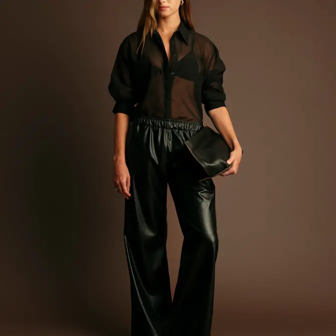 Sheer shirt with point collar and long sleeves with buttoned cuffs. Front button closure.