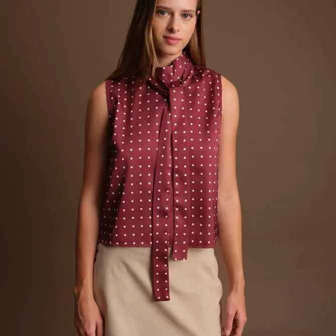 Satin sleeveless top with high neck. Self tie bow on neck. Printed. Bust darts for shaping. Back slit with inner button for closure
